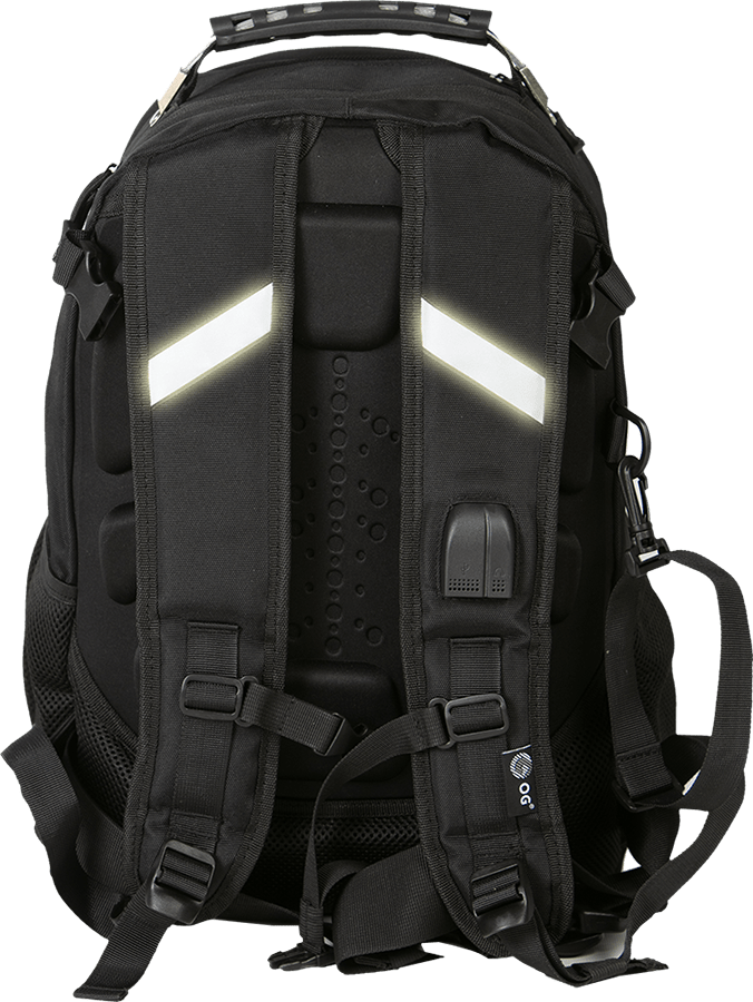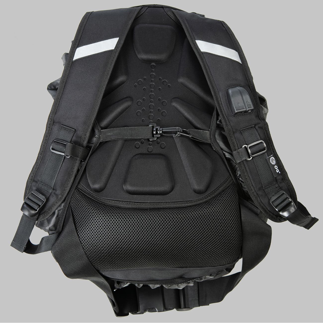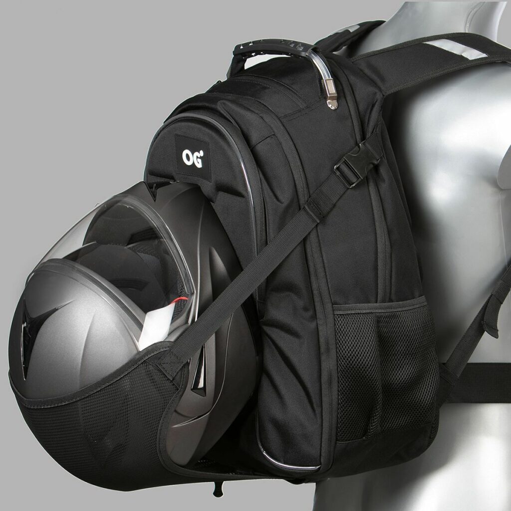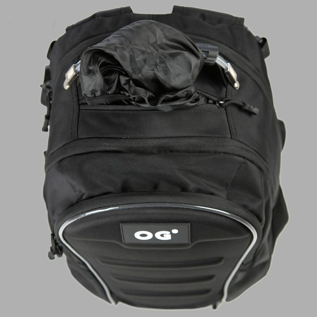 You can use this OG backpack’s elasticated helmet holder to secure even the largest full-face motorcycle helmet to the back of the pack, as seen in the main picture on the product page. This leaves an expensive helmet with a delicate visor too exposed for my liking, though – too easy to bash it off walls or hard surfaces while wearing the pack. I prefer to put my full-face helmet inside the main compartment of the backpack, as seen in my photographs. The inner compartments are well padded on all sides, offering excellent protection to contents. The main inner compartment can zip shut even with a full-face helmet inside it. I left it unzipped in my photos just to show that my extra-large full-face motorcycle helmet fits comfortably inside the pack. It’s possible to stow one helmet in the main compartment and one outside in the elasticated helmet holder. This is handy if you’re in the habit of carrying a spare helmet for a friend or co-rider, making this backpack an ideal choice for anyone touring by motorcycle. The main compartment has a few pockets. There’s also a secondary, slightly smaller compartment completely separate from the main one. The pack is heavily padded on all sides, especially the front and back, which have layers of ultra-durable EVA for extra protection. One feature I particularly like is the steel rope running through the top handle’s hollow plastic – this gives the handle huge strength. The entire pack has a heavy-duty build quality. Everything about it feels substantial. Nothing’s flimsy. The back straps feature reflective strips which catch light extremely well, as can be seen in one of my photos (which was taken with flash). The reflective strips are minimal in size, though. A larger reflective area would have been better from a safety point of view. Each side of the pack has a mesh pocket large enough for a water bottle or something of that ilk. The pack also has a USB connection and a small headphone jack built in, so you can keep your devices safe and dry inside the main compartment while still being able to access them.