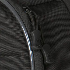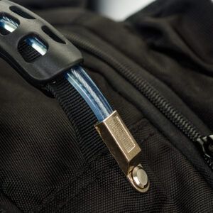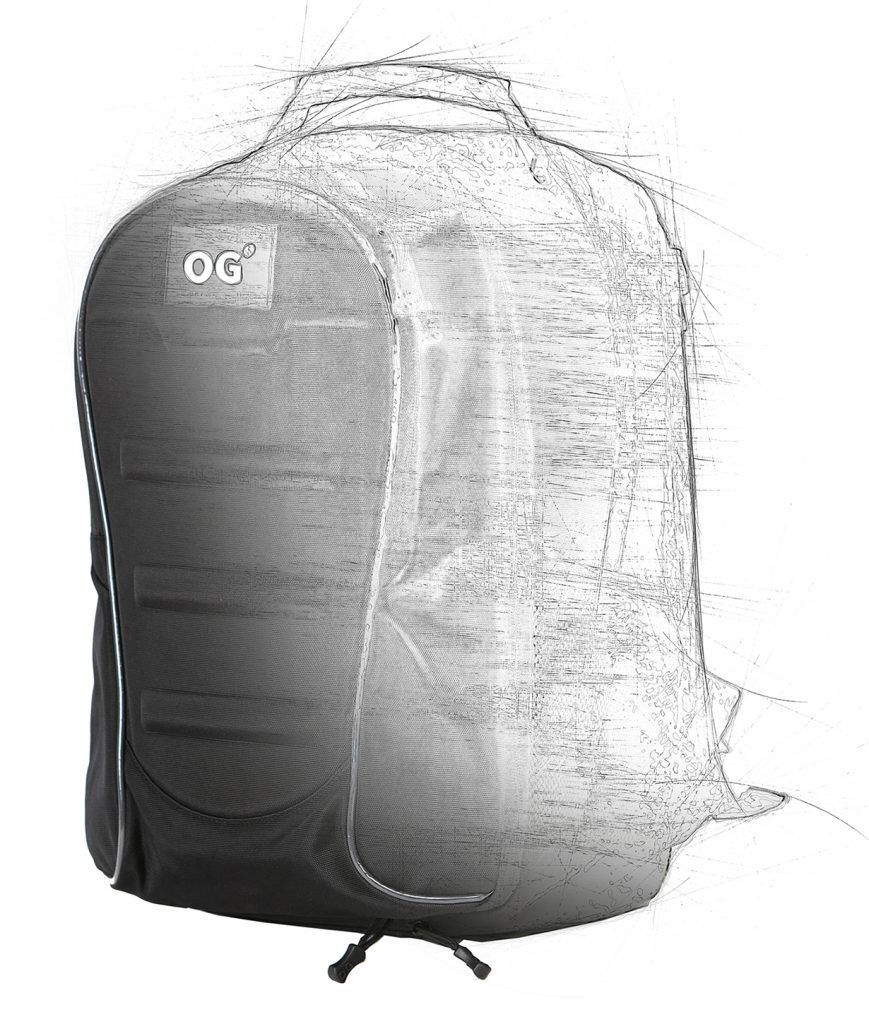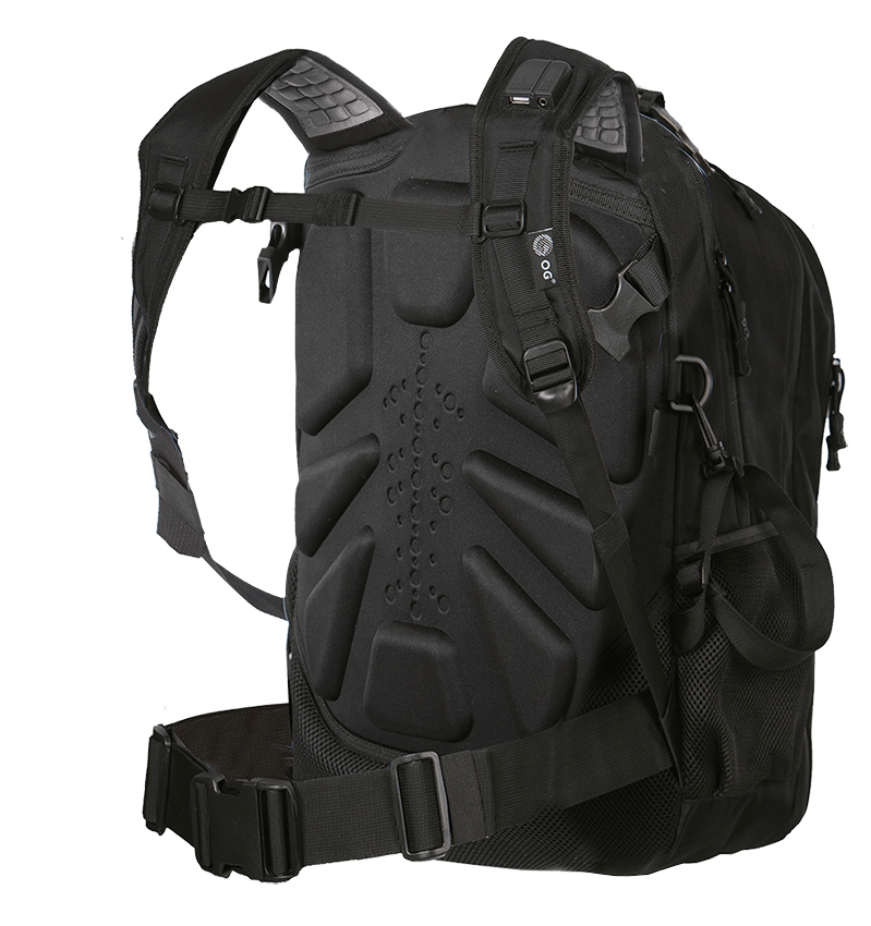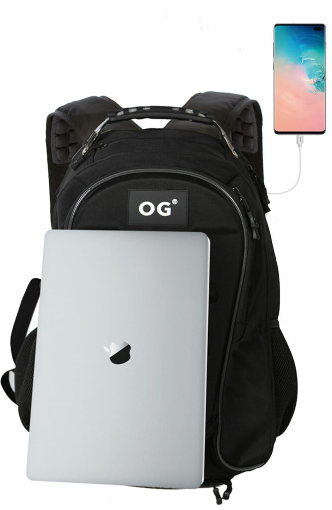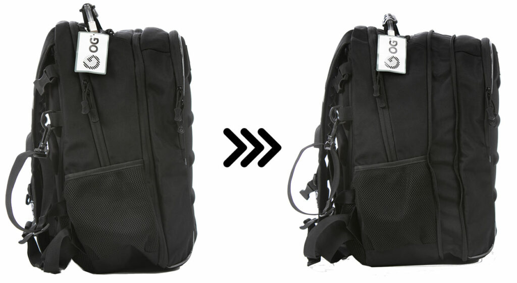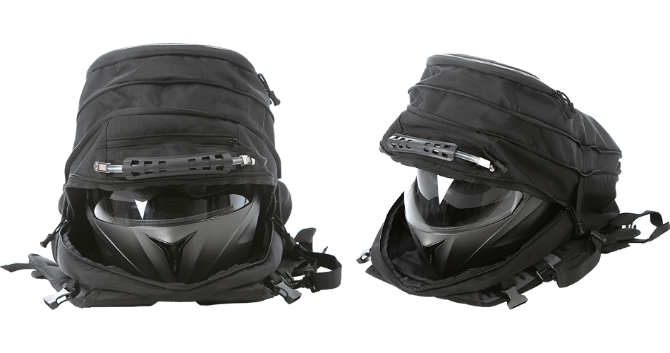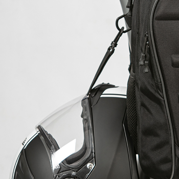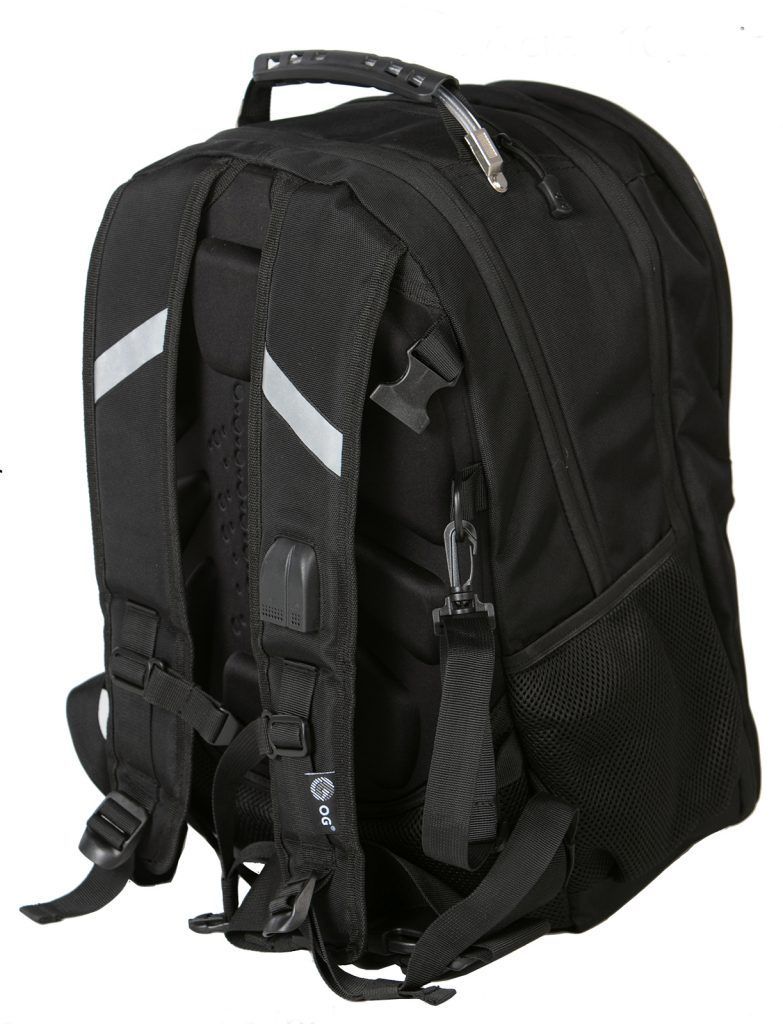 You can use this OG backpack’s elasticated helmet holder to secure even the largest full-face motorcycle helmet to the back of the pack, as seen in the main picture on the product page. This leaves an expensive helmet with a delicate visor too exposed for my liking, though – too easy to bash it off walls or hard surfaces while wearing the pack. I prefer to put my full-face helmet inside the main compartment of the backpack, as seen in my photographs. The inner compartments are well padded on all sides, offering excellent protection to contents. The main inner compartment can zip shut even with a full-face helmet inside it. I left it unzipped in my photos just to show that my extra-large full-face motorcycle helmet fits comfortably inside the pack. It’s possible to stow one helmet in the main compartment and one outside in the elasticated helmet holder. This is handy if you’re in the habit of carrying a spare helmet for a friend or co-rider, making this backpack an ideal choice for anyone touring by motorcycle. The main compartment has a few pockets. There’s also a secondary, slightly smaller compartment completely separate from the main one. The pack is heavily padded on all sides, especially the front and back, which have layers of ultra-durable EVA for extra protection. One feature I particularly like is the steel rope running through the top handle’s hollow plastic – this gives the handle huge strength. The entire pack has a heavy-duty build quality. Everything about it feels substantial. Nothing’s flimsy. The back straps feature reflective strips which catch light extremely well, as can be seen in one of my photos (which was taken with flash). The reflective strips are minimal in size, though. A larger reflective area would have been better from a safety point of view. Each side of the pack has a mesh pocket large enough for a water bottle or something of that ilk. The pack also has a USB connection and a small headphone jack built in, so you can keep your devices safe and dry inside the main compartment while still being able to access them.